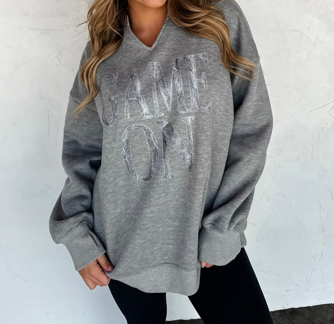 Featuring a “Game On” DTF graphic in a monochromatic gray camo design, this sweatshirt brings subtle spirit and everyday wearability together in one perfect piece. Pair it with jeans, leggings, or cargos for an easy game-day-ready look.